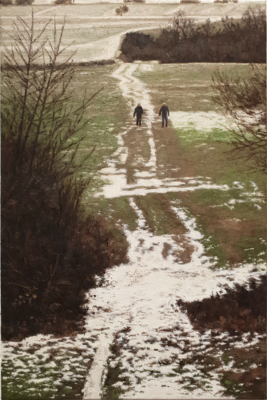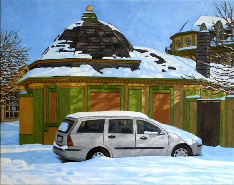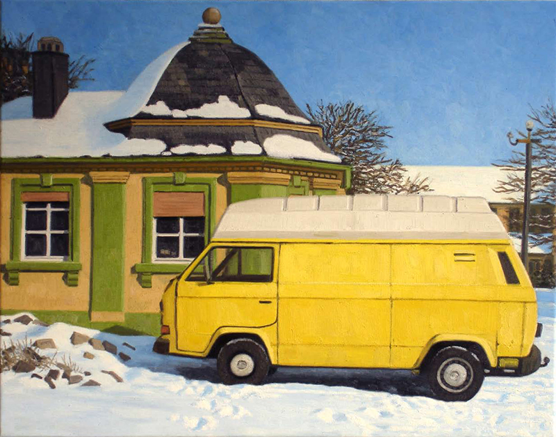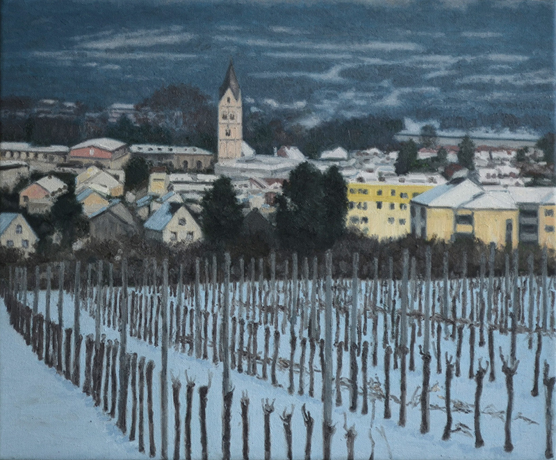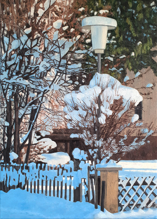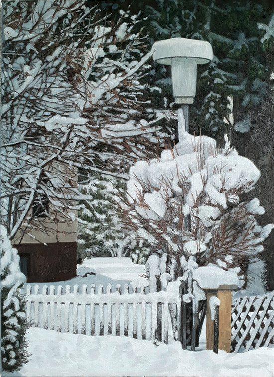 Mit erstaunlicher Beharrlichkeit insistiert der Künstler auf Schnee und Winterzeit, die doch inzwischen historisch geworden ist. Freude am unmittelbaren, frischen Sinneseindruck, Stillleben im schönsten Sonnenlicht oder die Magie eines unbewegten Augenblicks, in pastose Malerei gefasst.