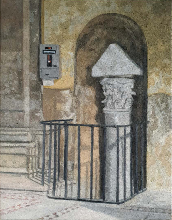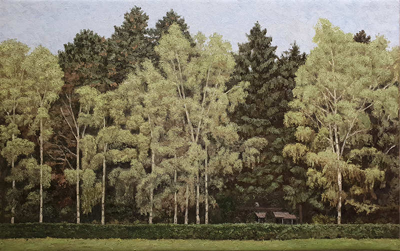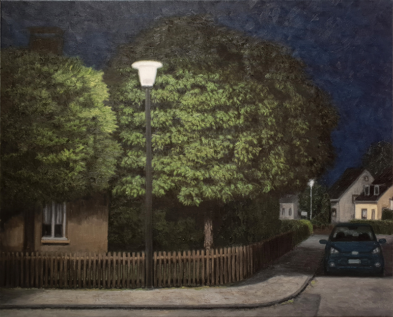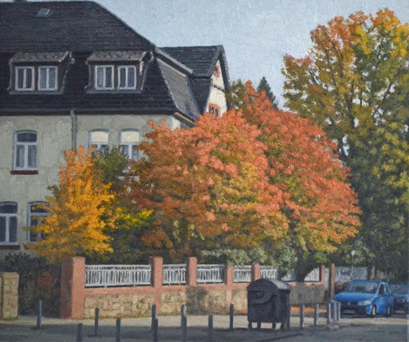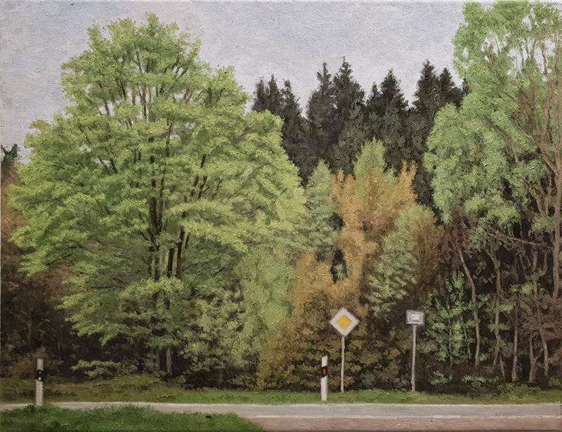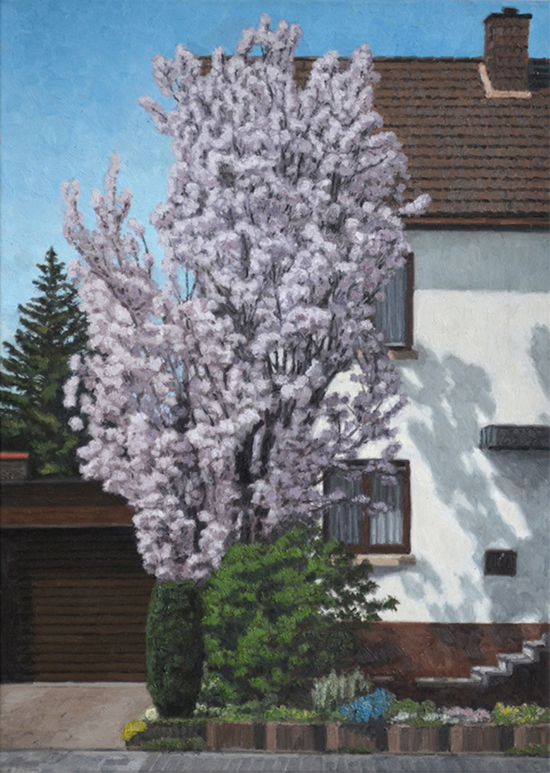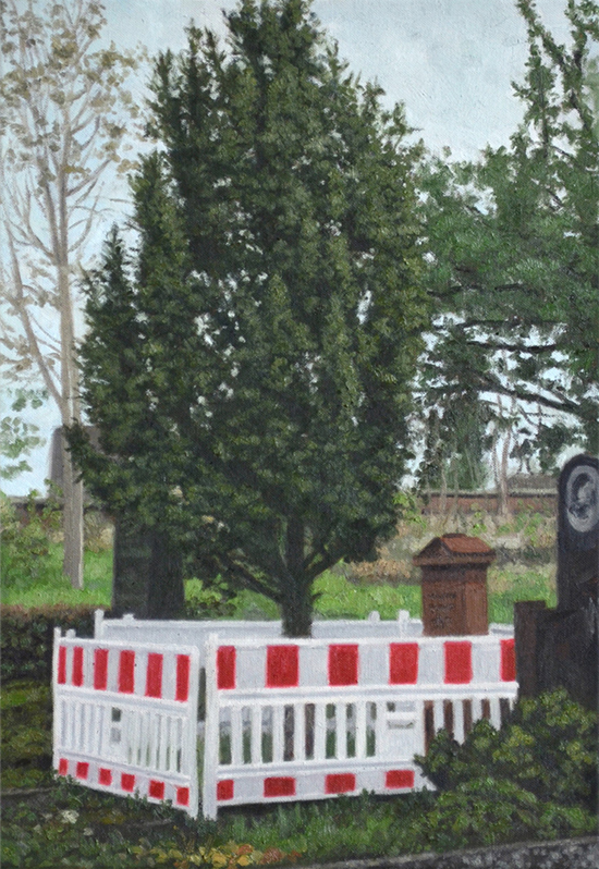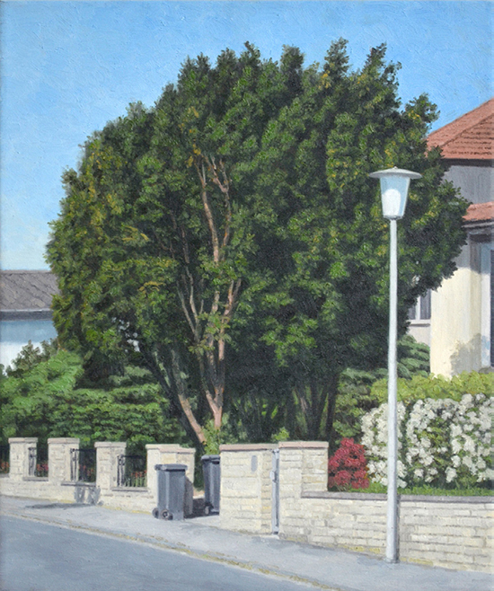 Thema der gegenständlichen Arbeiten ist die Motivwelt unserer städtischen Alltagswirklichkeit. Natur zeigt sich als Restnatur im architektonischen Kontext unserer zivilen, gesicherten Welt. Es entstehen Baumportraits, in denen sich womöglich die Schönheit und Würde von Natur in ihrem Nischendasein behaupten kann.