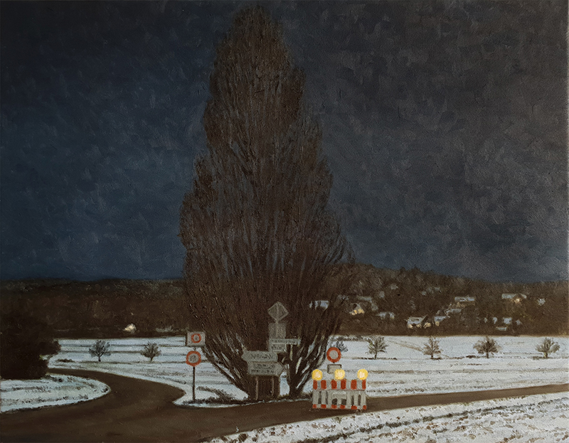 Die eigengesetzliche Wirkungsmacht der Industriegesellschaft schafft die Jahreszeiten und die Intaktheit der Landschaft ab. In den Bildern geben sich Attribute der Technik und Architektur mit der Natur ein ironisches wie beschauliches Stelldichein.